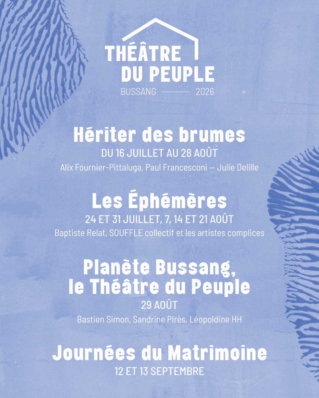 Du 16 juillet au 13 septembre 2026, l’utopie bussenette rêvée par Maurice et Camille Pottecher prendra la forme d'une fiction théâtrale en 6 épisodes, Hériter des brumes - La folle histoire du Théâtre du Peuple, écrite par Alix Fournier-Pittaluga et Paul Francesconi, mise en scène par Julie Delille. Expérimentée la saison dernière, fin août, dans un théâtre de verdure improvisé, elle avait séduit quelques centaines de spectateurices privilégié·es. Présentée pour cette édition dans l'écrin même de l'immense cabane en bois qu'est le Théâtre du Peuple, elle bougera certaines habitudes de représentation : dès 11 h, elle donnera rendez-vous à tous les publics (à partir de 8 ans), pour une grande saga intense, artistique et humaine, en suivant la course du soleil. Plus d'un siècle traversé en quelques heures, ponctuées de pauses conviviales.